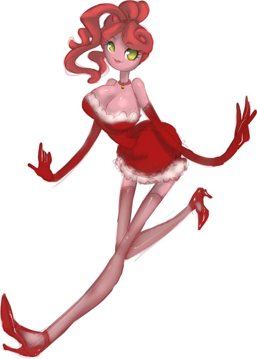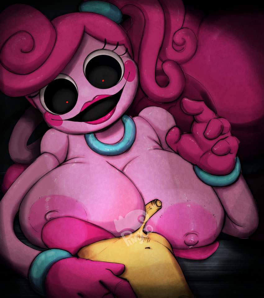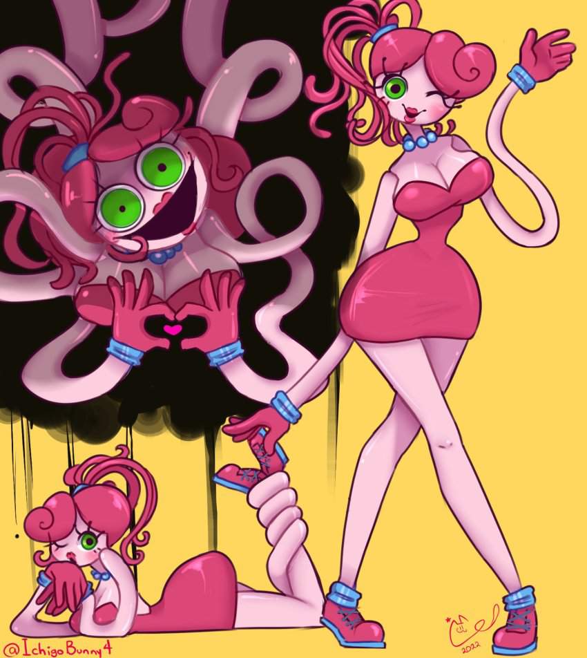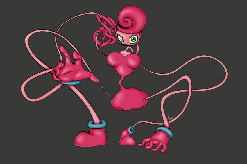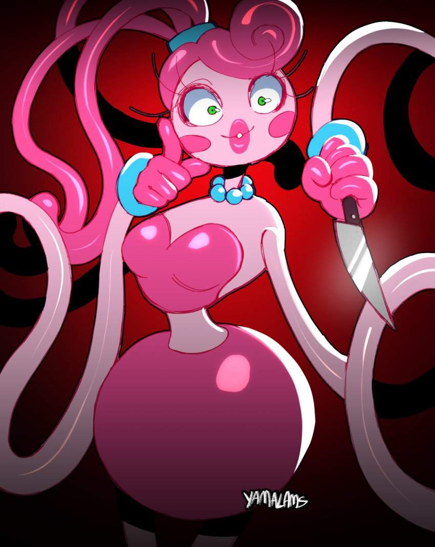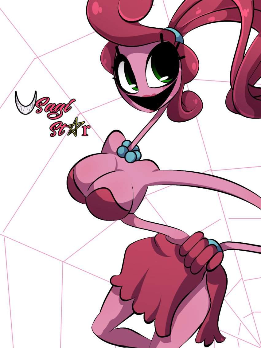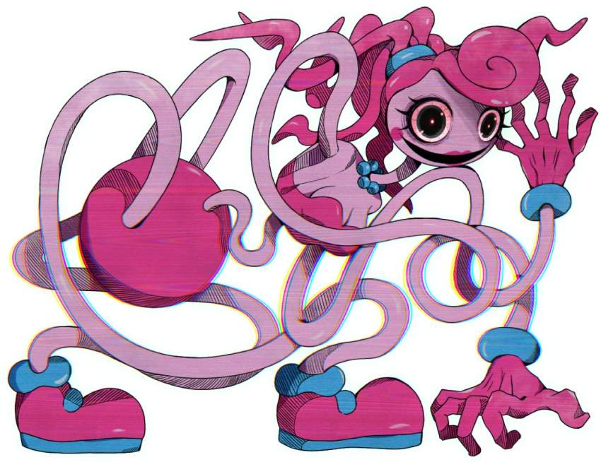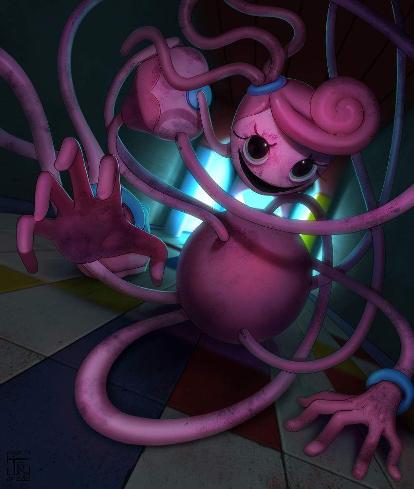 ホラーゲーム「Poppy Playtime」のチャプター2「FLY IN A WEB/クモの巣のハエ」に登場するMommyLongLegs(まみーろんぐれっぐす)のエロ画像です。ピンク色の体で飴細工のような髪と細長い手足、大きな緑色の目を持つ、女性の人形で”Mommy/マミー”という名前のとおり、夫(DaddyLongLegs/ダディー・ロングレッグス)と子供(BabyLongLegs/ベビー・ロングレッグス)がいるという設定のようです。